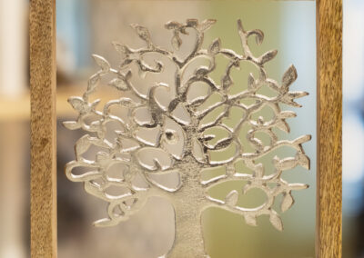 Entdecken Sie den Deko-Baum mit einem edlen Holzrahmen und filigranen Metalldesign, der Ihre Räume mit Wärme und Stil erfüllt.